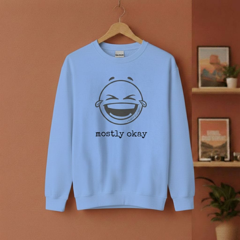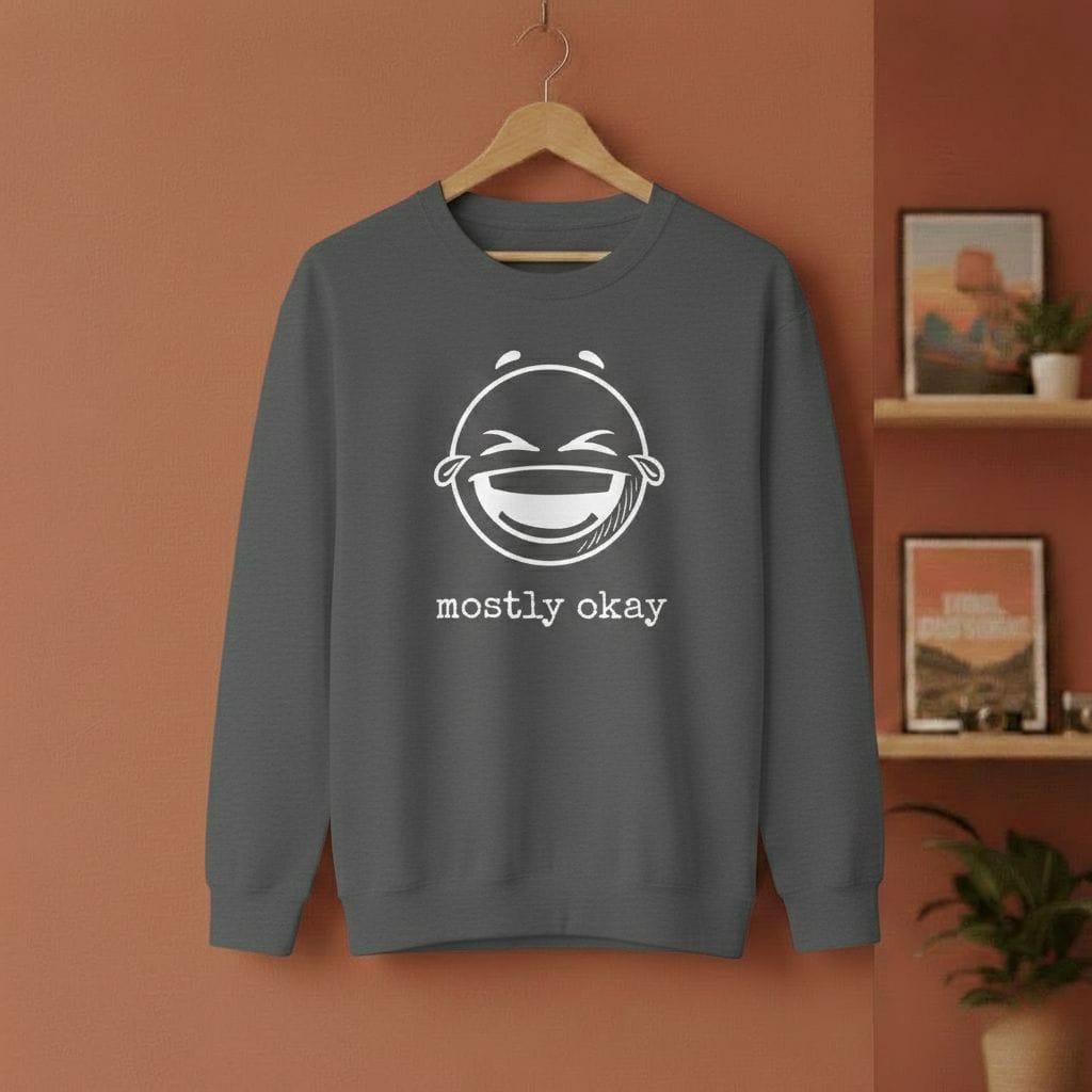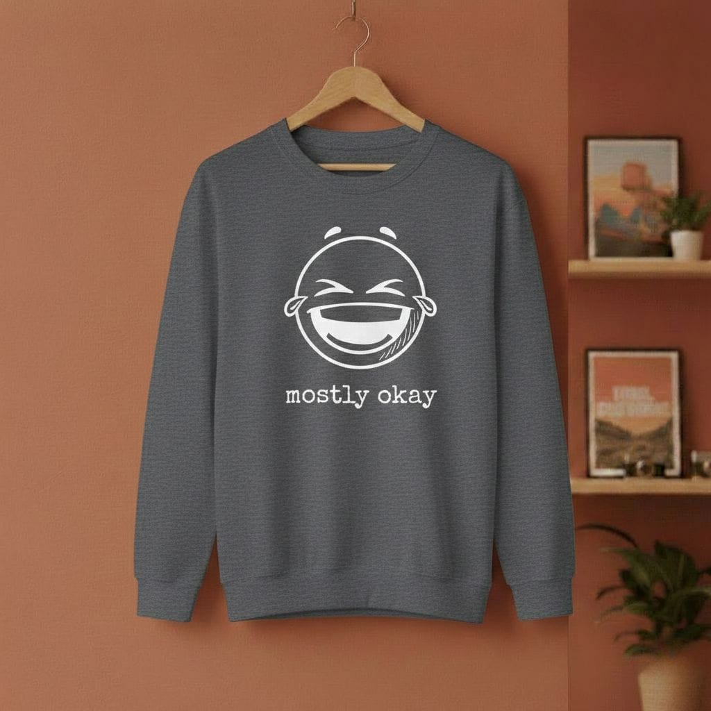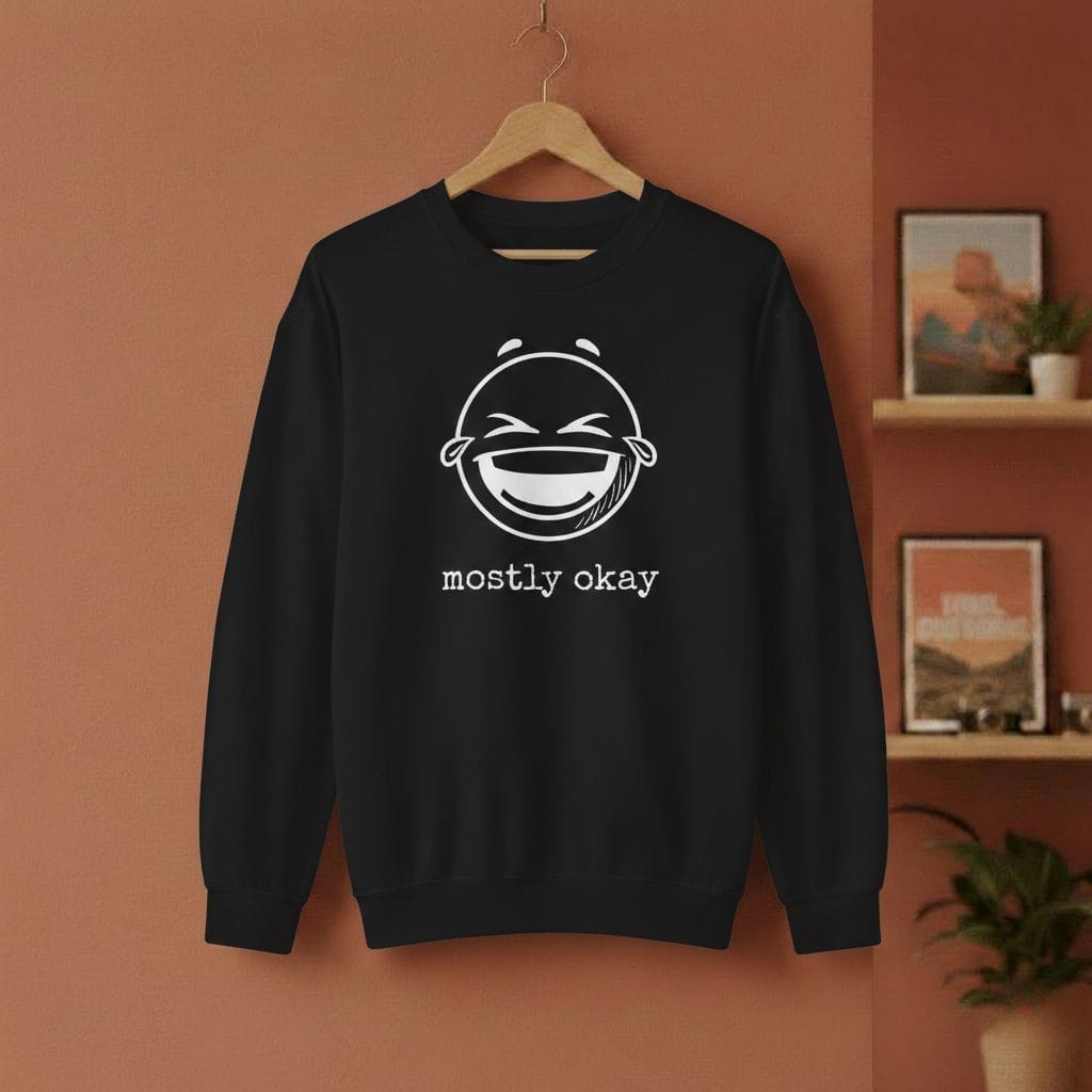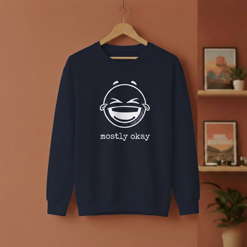 Perfekt unperfekt. Unser „Mostly Okay“ Hoodie ist für alle, die keinen Bock auf toxische Positivität haben. Ein fetter, satter Smiley-Print trifft auf die ehrlichste Botschaft des Jahres. Ob im Office, in der Uni oder beim Scrollen auf der Couch – dieser Hoodie sagt alles, ohne dass du den Mund aufmachen musst.