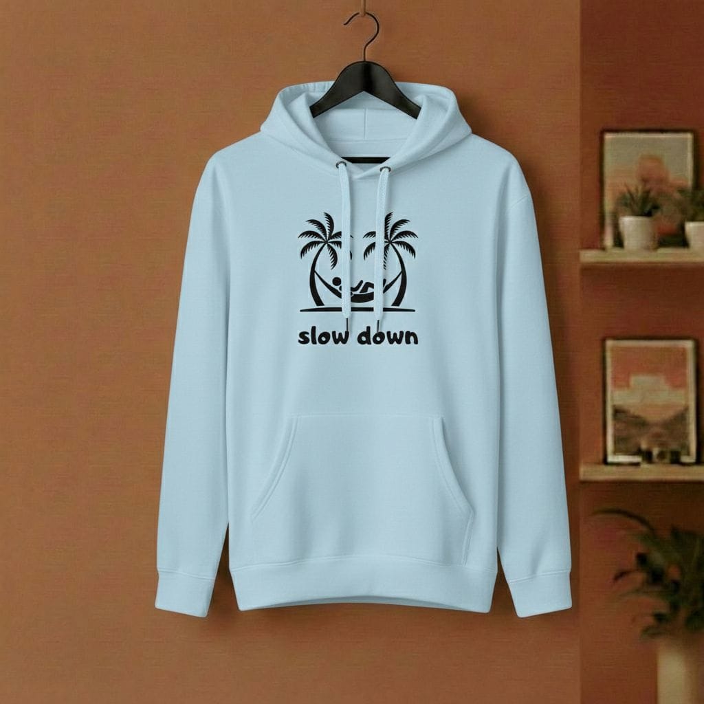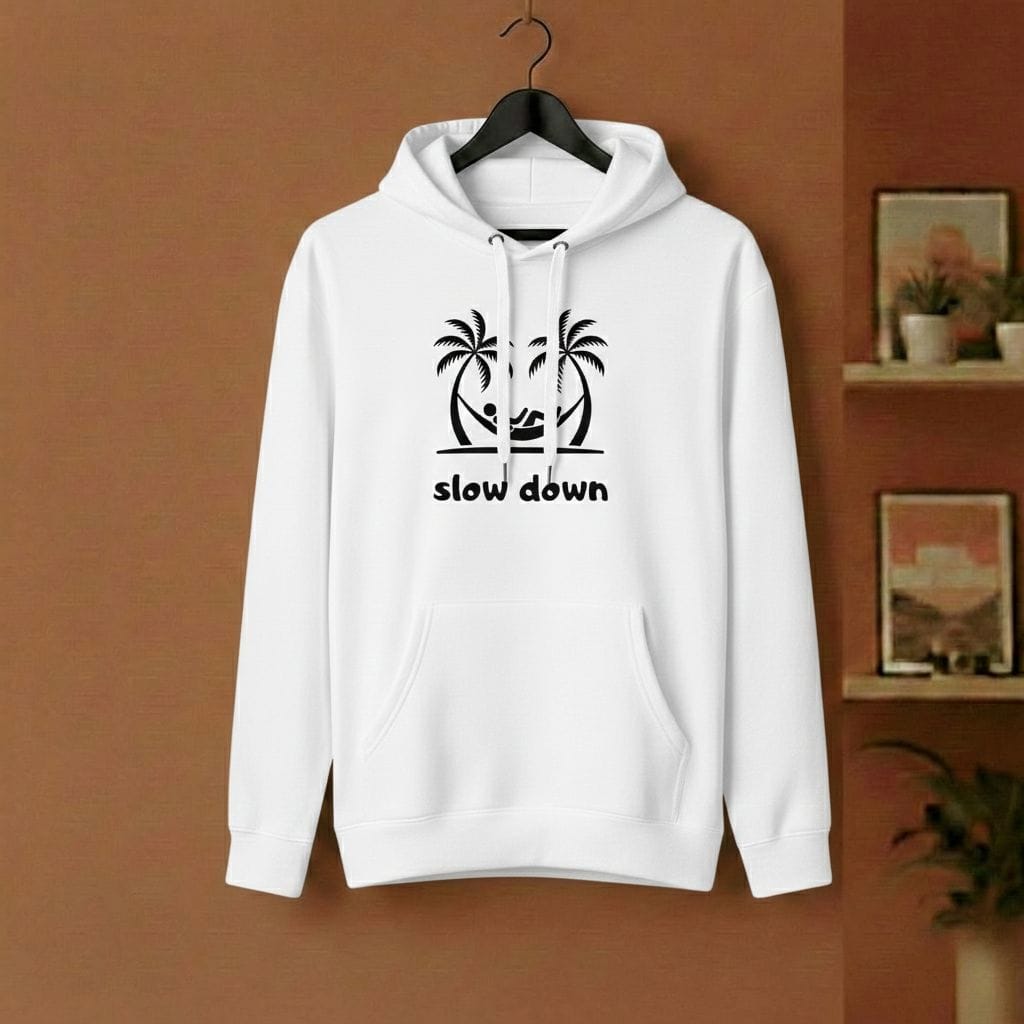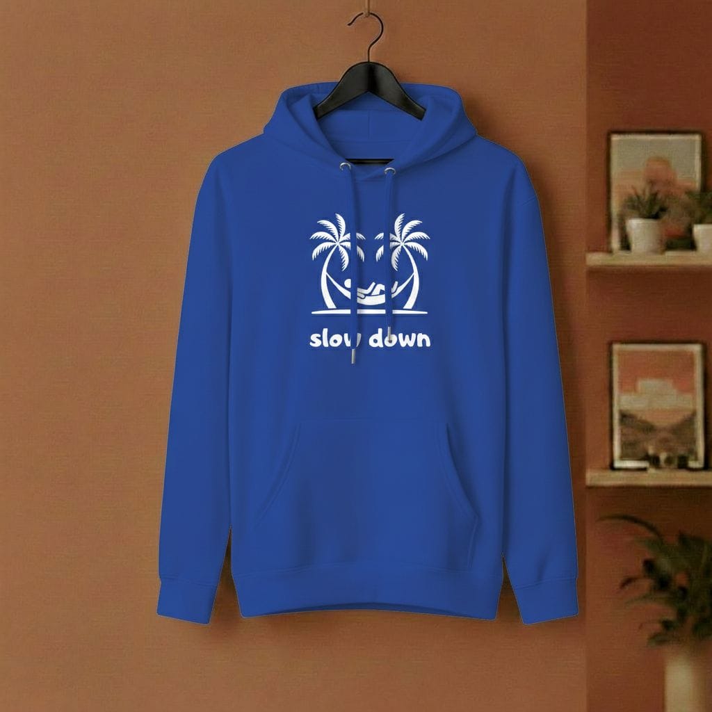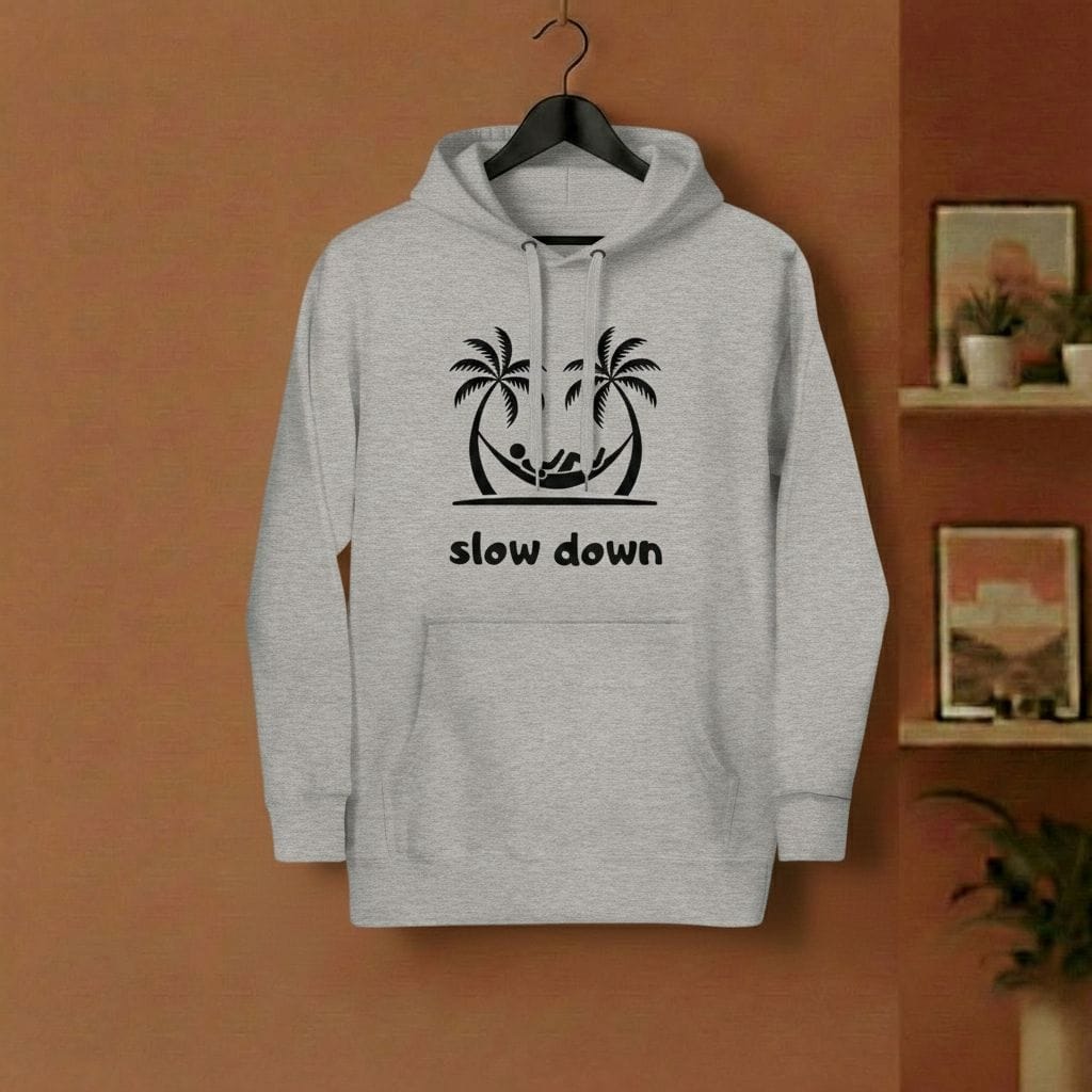 Das Meeting hätte eine E-Mail sein können? Die Stadt ist zu laut? Zieh die Reißleine. Unser „Slow Down“ Hoodie ist deine tägliche Erinnerung, einen Gang runterzuschalten. Das Motiv – zwei Palmen, eine Hängematte und das Rauschen des Ozeans im Kopf – bringt das Urlaubsgefühl direkt in deinen Alltag. Kein Stress, keine Eile, nur du und der Moment.